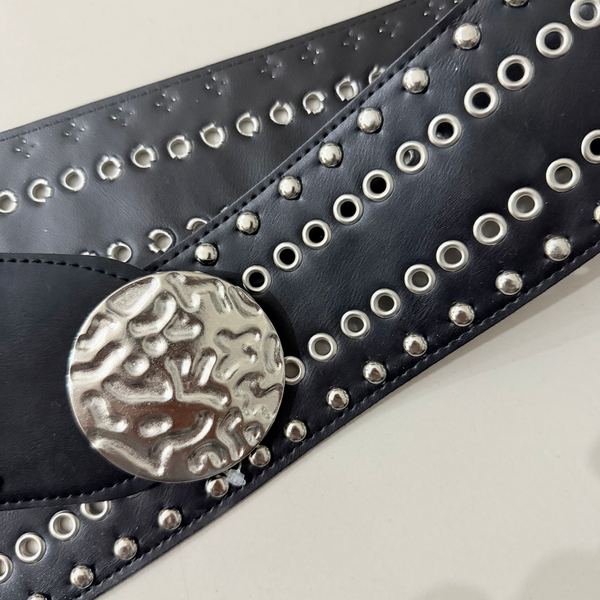 🔹 Faja DAK, de ecocuero, con full tachas y ojales, hebilla metálica plateada con relieve