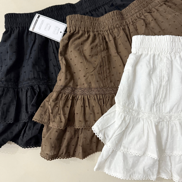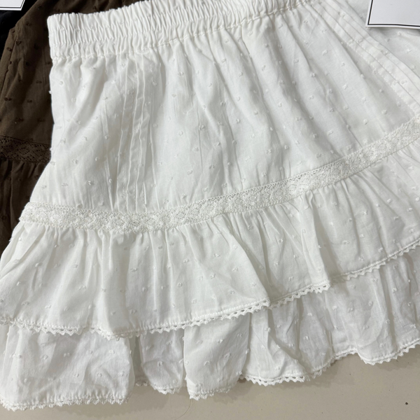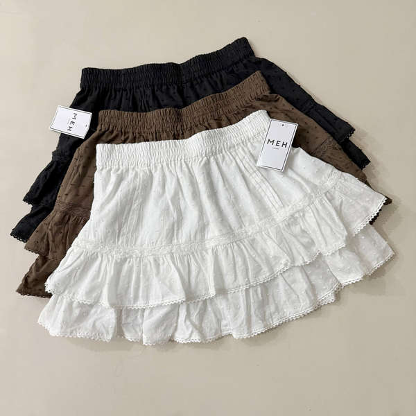 🔹 Falda AUKARIA de lino con detalle de plumeti en toda la pollera, con volados y elástico en la cintura.