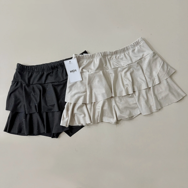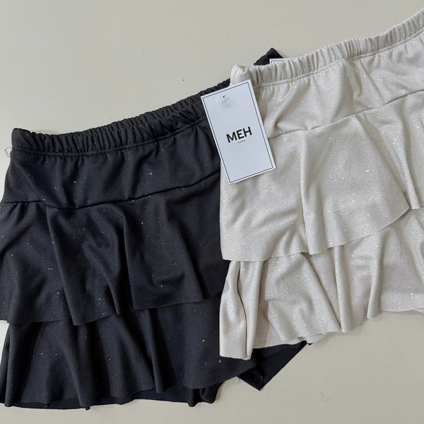 🔹 Mini de microfibra con glitters y frunce en cintura y volados, tiro bajo