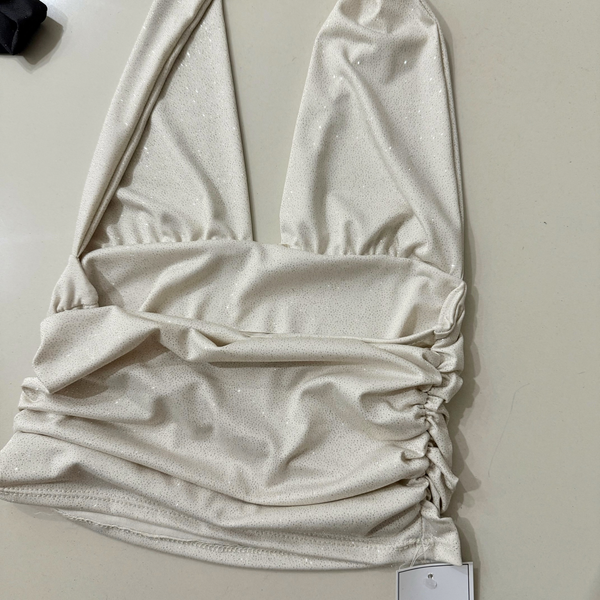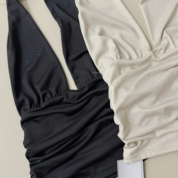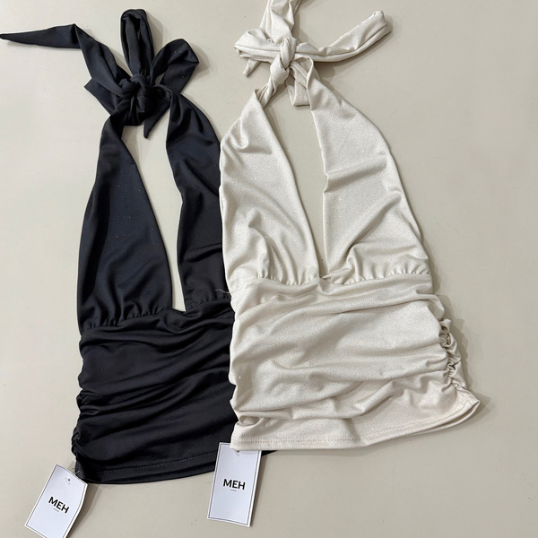 🔹 Top COAT de microfibra con glitter s, con tiras para atar en la nuca y sutiles frunces laterales