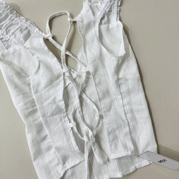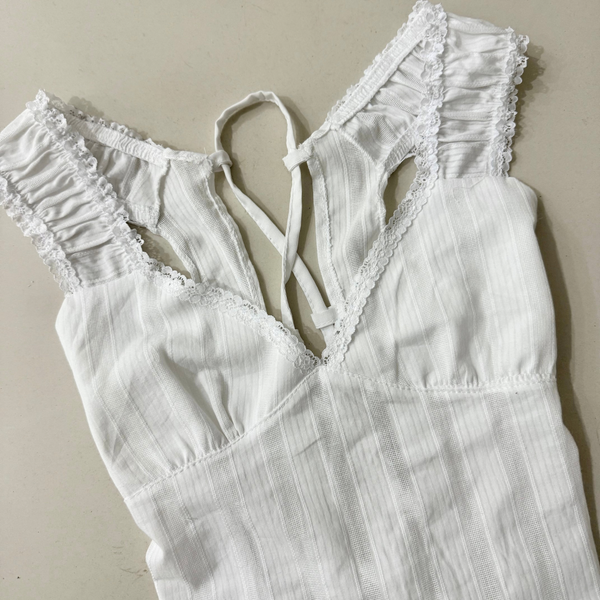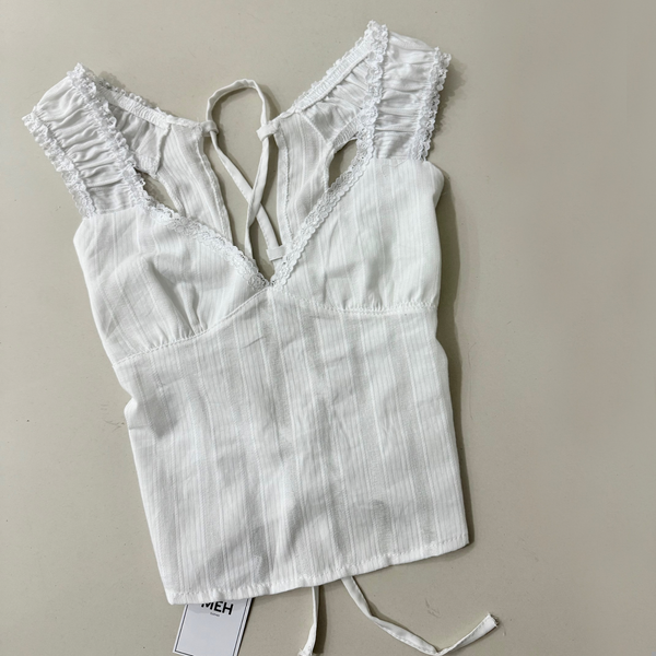 🔹 Top DERBY, de poplin tramado, con detalles puntilla, y tiras cruzadas en espalda