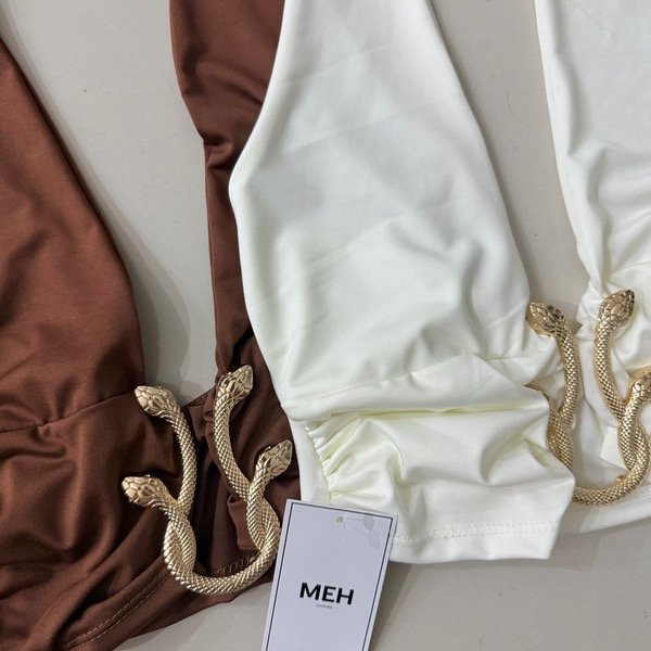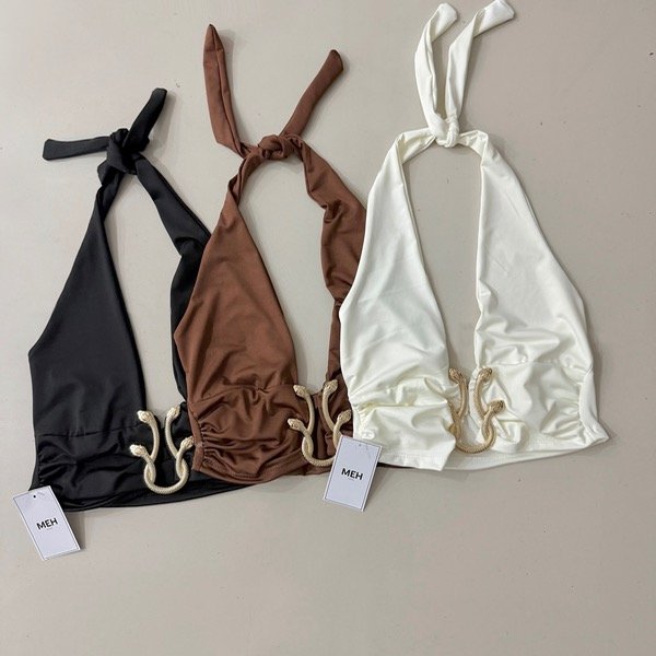 🔹 Top halter con avío metálico medio dorado, espalda descubierta y tiras para atar en la nuca.