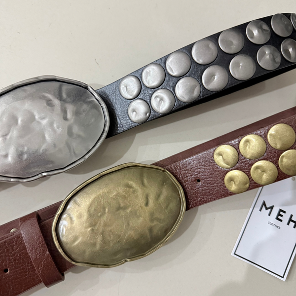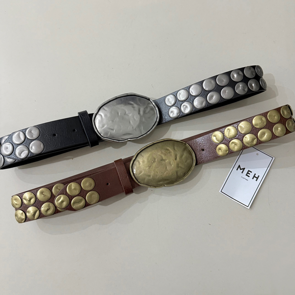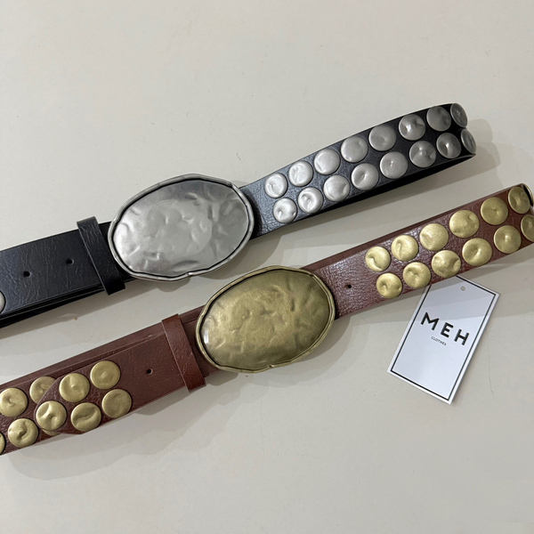 🔹 Cinturón importado ecocuero IKeR con tachas rectas en tono gris/dorado. Y hebilla en forma de nube en mismo tono.