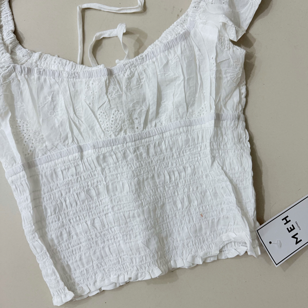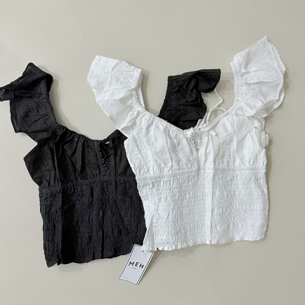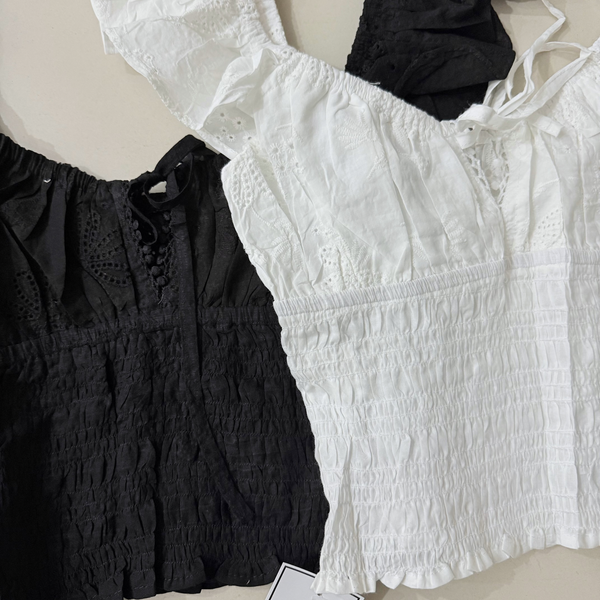 🔹 Blusa RAFIN con drapeado y detalles en broderie. Con sutiles volados y tiras para atar al centro.