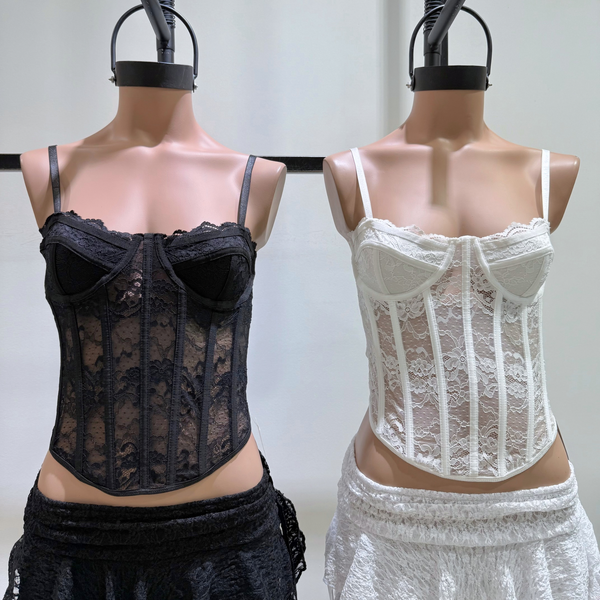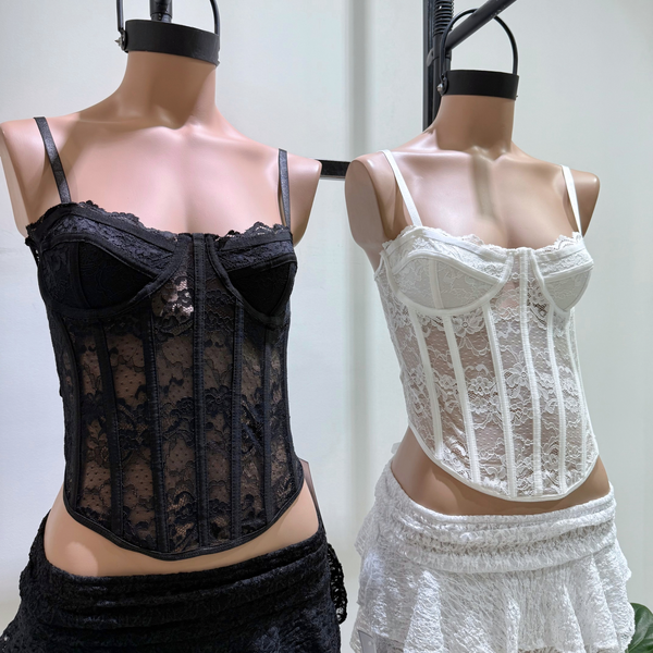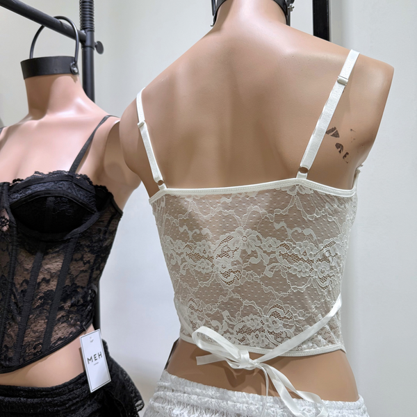 🔹 Corset WARRI, full encaje con ballenas, detalles puntilla en busto, breteles regulables, posterior detalle lazo seda.