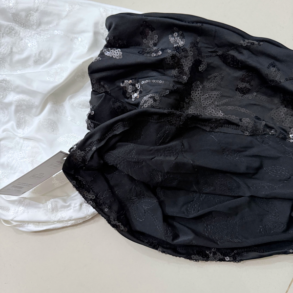🔹 Mini TAMI, de microfibra con lentejuelas bordadas con frunces y forro interno. Tiro bajo