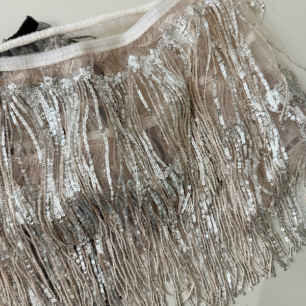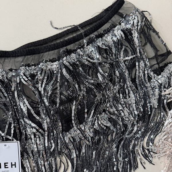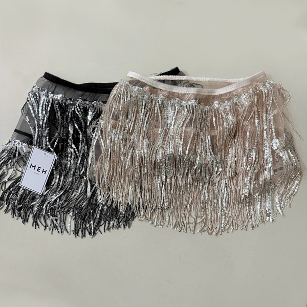 🔹 Mini de microtull con detalle de lentejuelas en flecos en todo su contorno. Tiro bajo