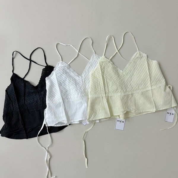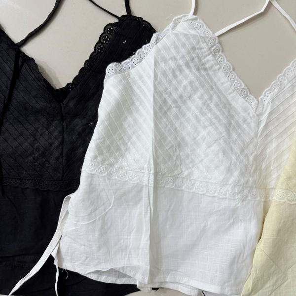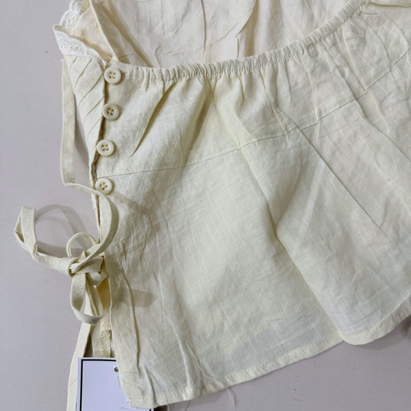 🔹 Blusa IRI, importada con detalles tramados y broderie, con botones laterales, y tiras para atar laterales. Con breteles regulables.