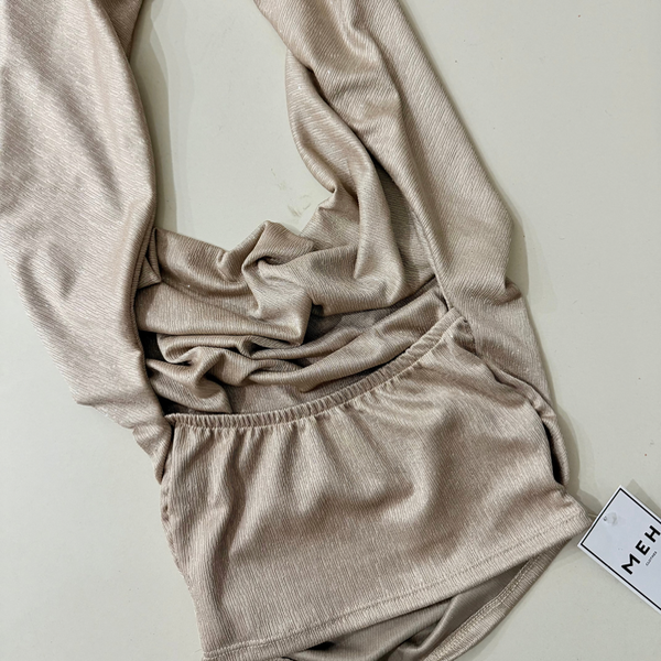 🔹 Top ARCHI cuello buche, de microfibra glitter, espalda descubierta