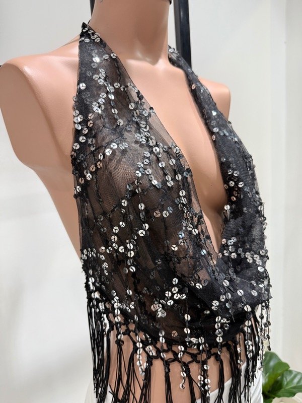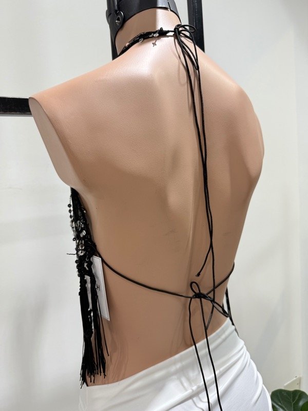 🔹 Top CAPRIA cuello buche con lentejuelas y flecos, con tiras para atar en la nuca y espalda.
