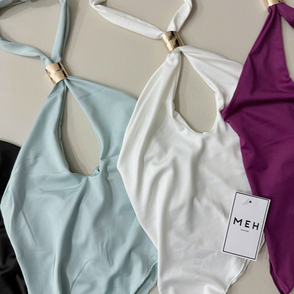 🔹 Top de microfibra con detalle hebilla media. Con tiras para atar en la nuca. Por debajo caída pico lateral y pequeño tajo.