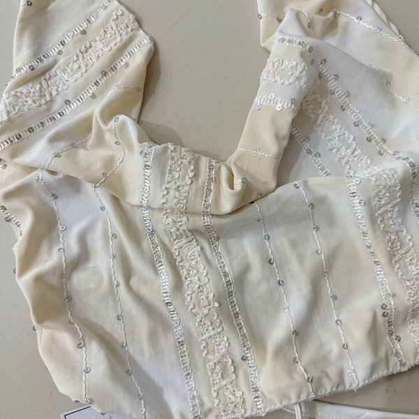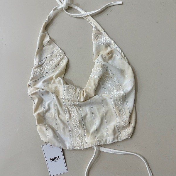 🔹 Top COSMO, con cuello buche. Detalle lentejuelas bordadas, espalda descubierta