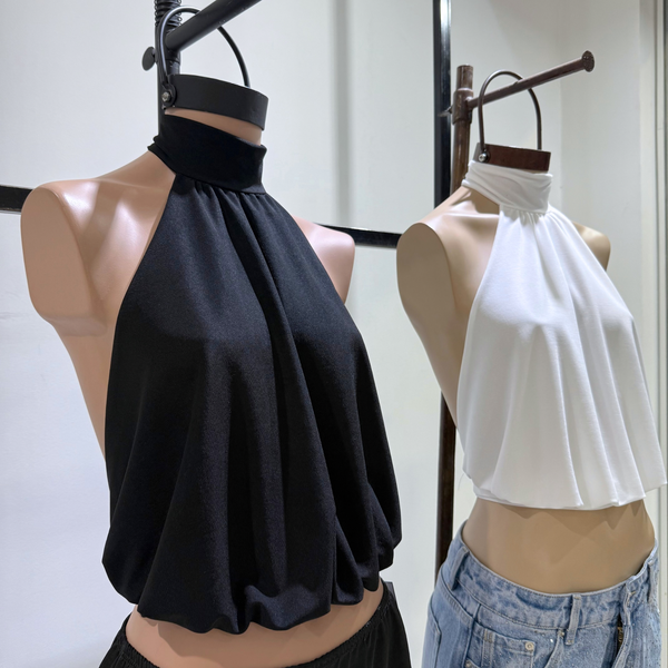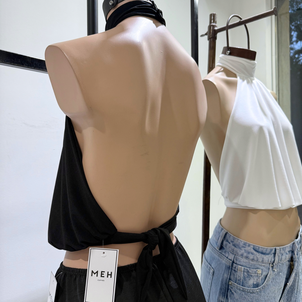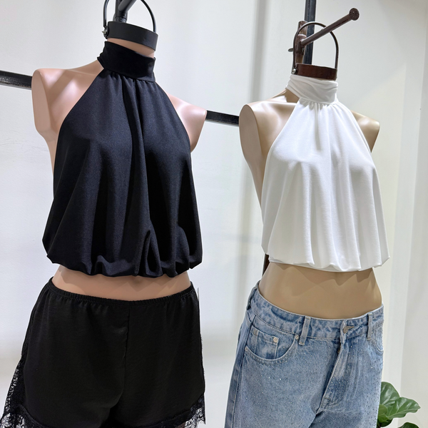 🔹 Top buche damasia, con escote Halter, espalda descubierta y tiras para regular en espalda.
