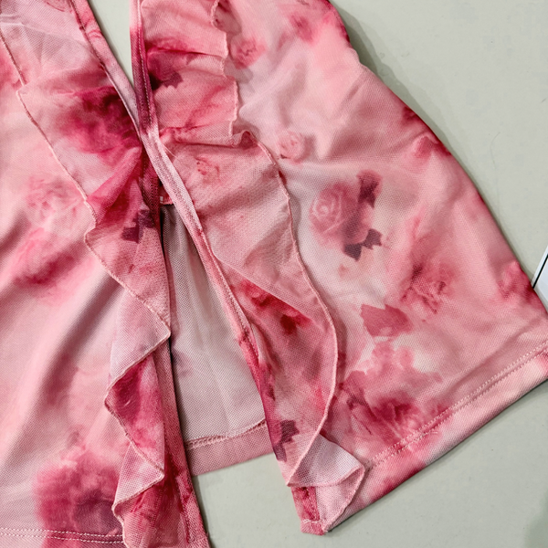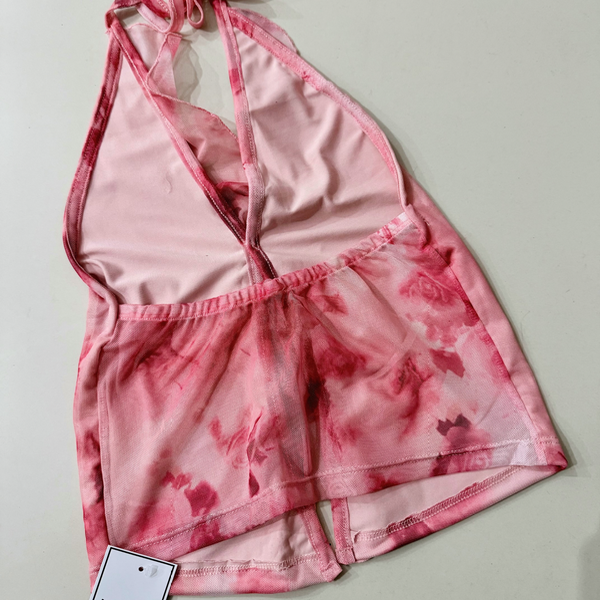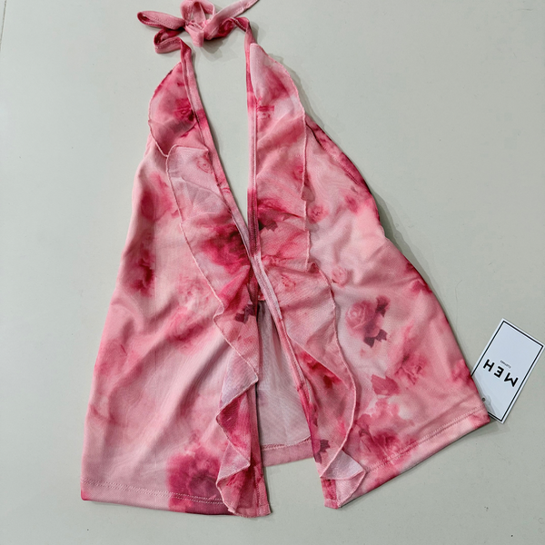 🔹 Top DANA de microtull estampado, con flecos medios y tiras para atar en la nuca, espalda semidescubierta