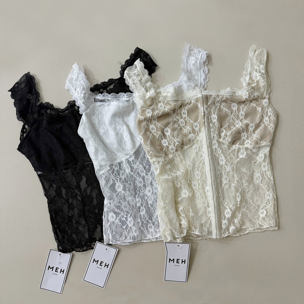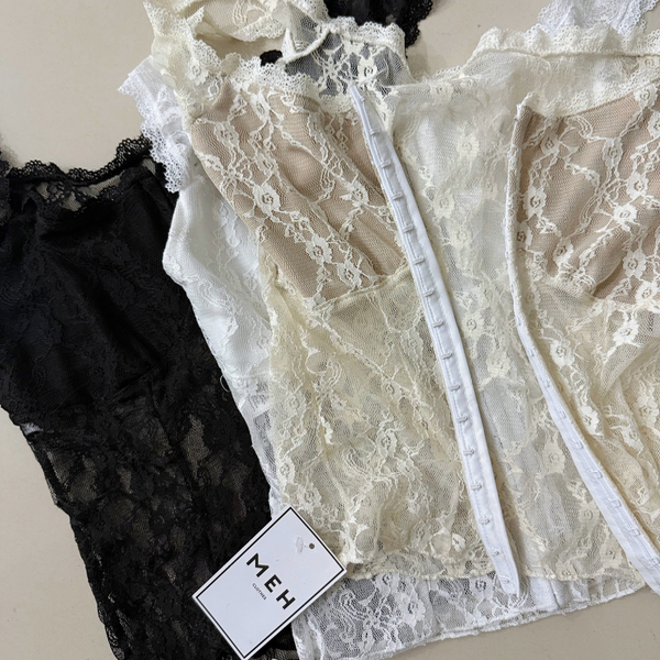 🔹 Top GREY tipo corsetero, de full encaje con forro en busto y cinta corsetera media