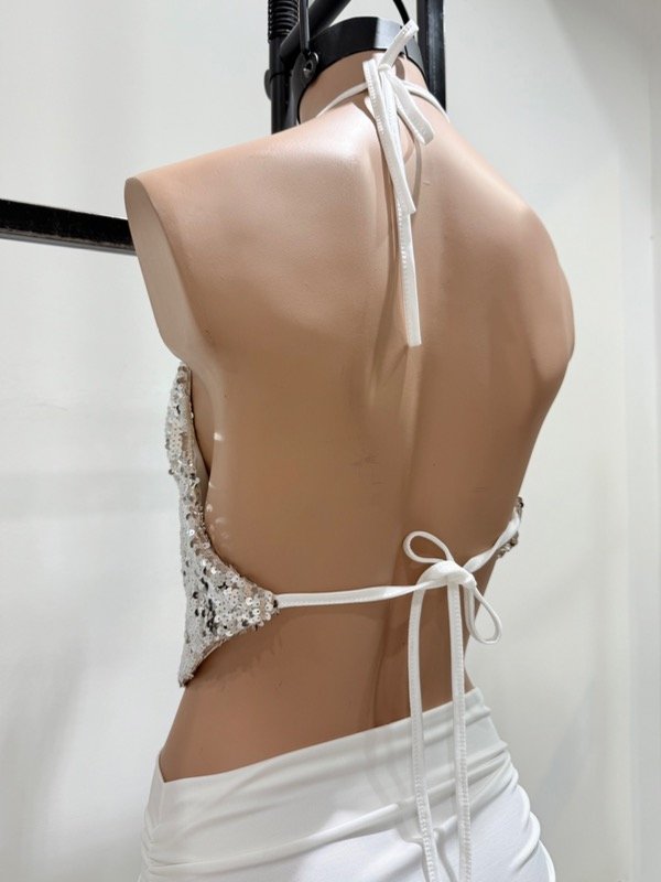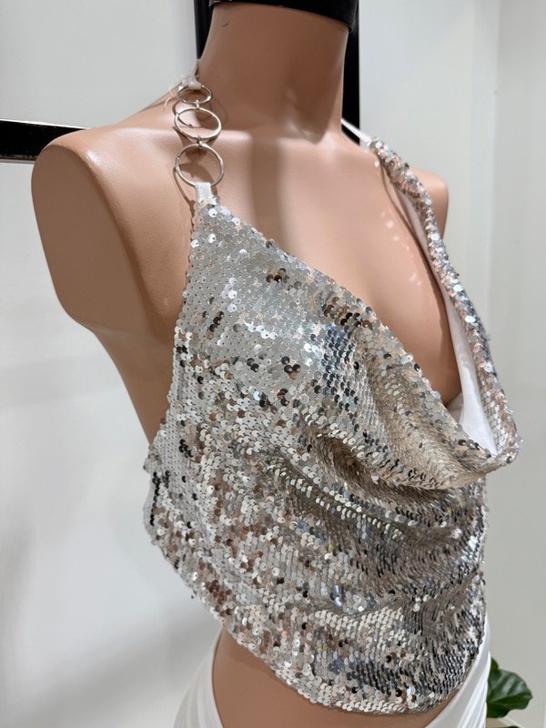 🔹 Top PANDORA cuello buche con lentejuelas, forro interno, tres arandelas, con tiras para atar en la nuca y espalda.