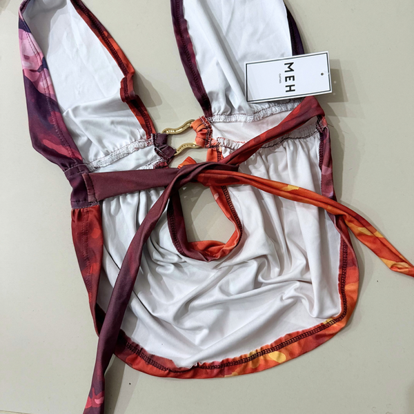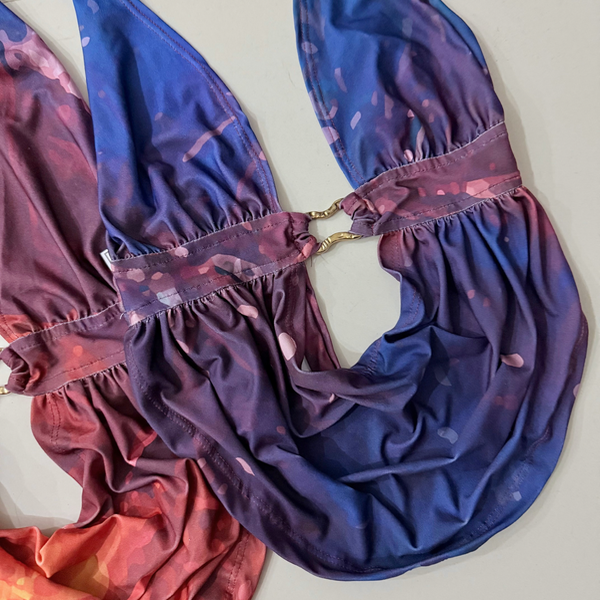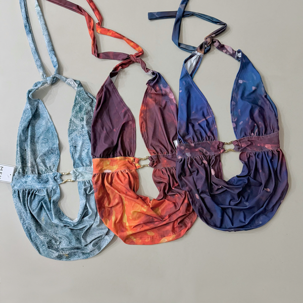 🔹 Top SANDER con buche y avío metálico en dorado vintage, tiras para anudar en cuello y espalda, de microfibra estampado