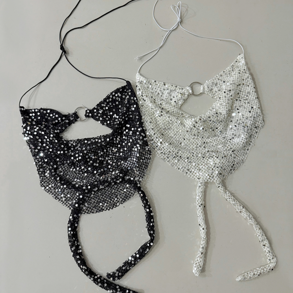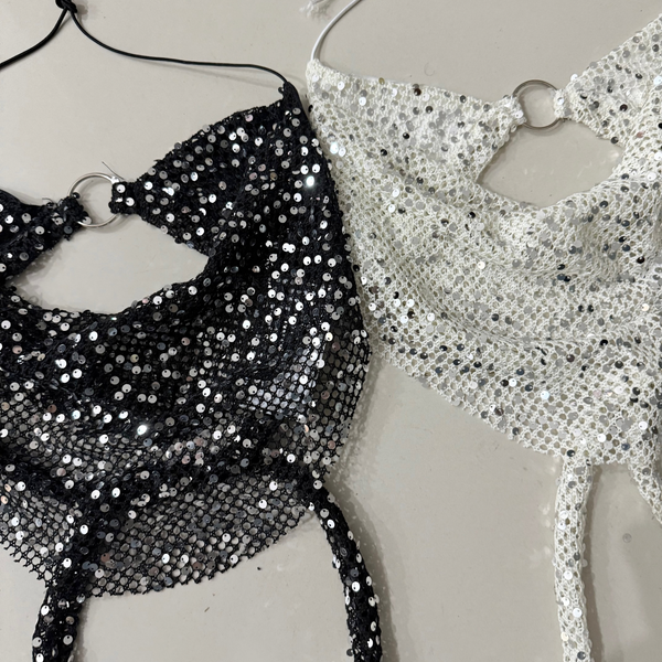🔹 top de crochet con lentejuelas WISS, con arandela media y buche, y tiras para atar en la nuca.
