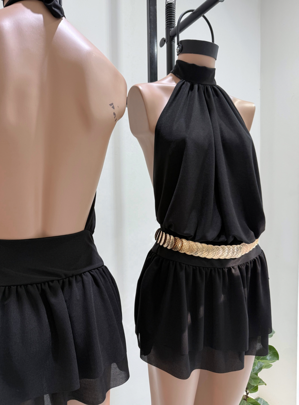 🔹 Vestido DELAIN, con escote buche, por abajo una simulación de mini, por atrás espalda descubierta