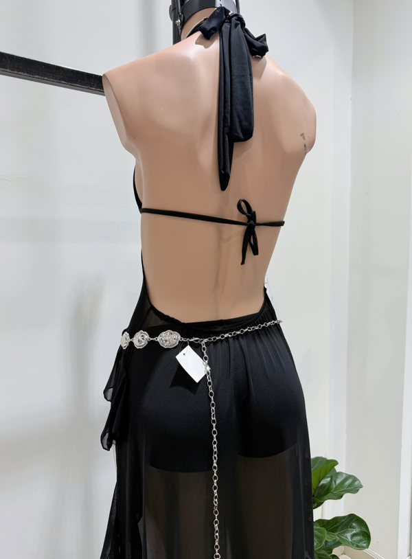 🔹 Vestido DRAVEN, largo marilyn sin espalda, tajo en la pierna, tiras para atar en nuca y espalda