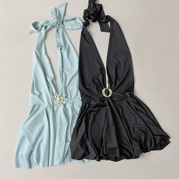 🔹 Vestido GIO, con microfibra con volados inferiores, y avío medio. Con tiras para atar en la nuca.