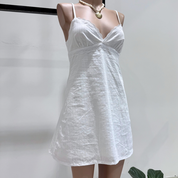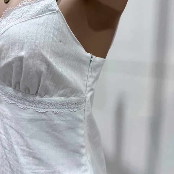 🔹 Vestido JANNA de poplin tramado, con breteles regulables, cierre lateral en busto y detalles en puntilla broderie