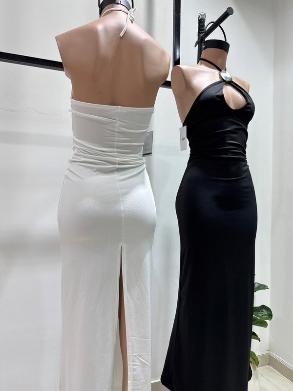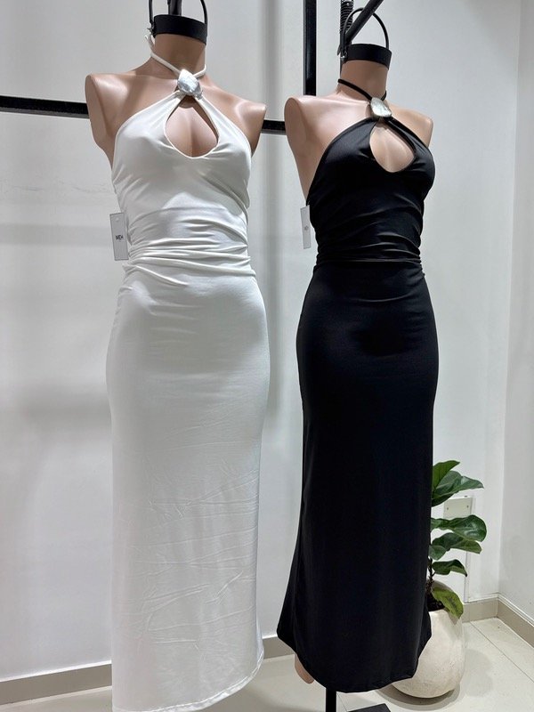 🔹 Vestido JULIE, con un avío en el cuello, espalda descubierta, tiras para atar en cuello y con tajo en la parte posterior.