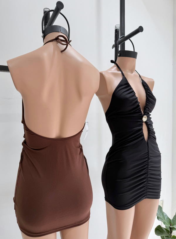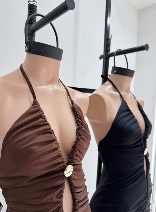 🔹 Vestido MILONE con detalle avío metálico medio y frunces, espalda semidescubierta